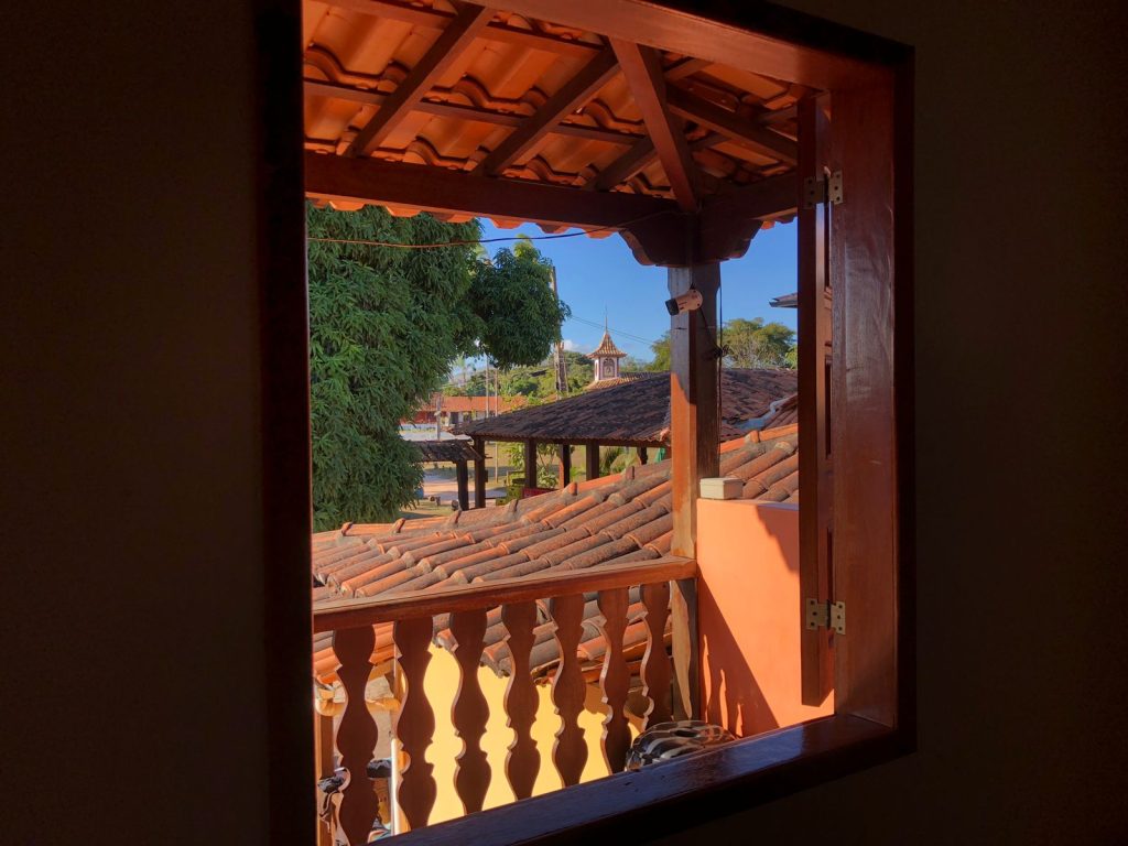 Suíte toda equipada com varanda compartilhada e vista para o Largo do Rosário.